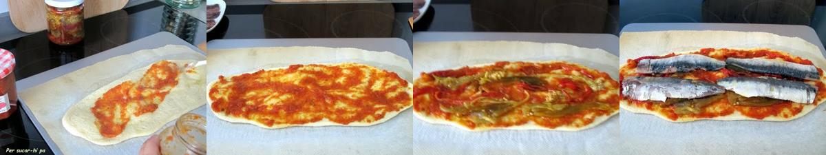 Esta es una de las coberturas típicas, pero hay muchas más, por ejemplo de butifarra, setas, atún... Puede decirse que no tiene receta fija y se puede añadir cualquier producto que se tenga a mano.