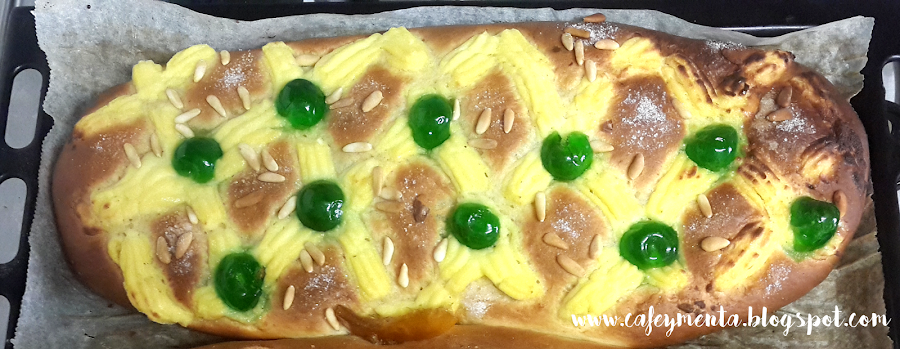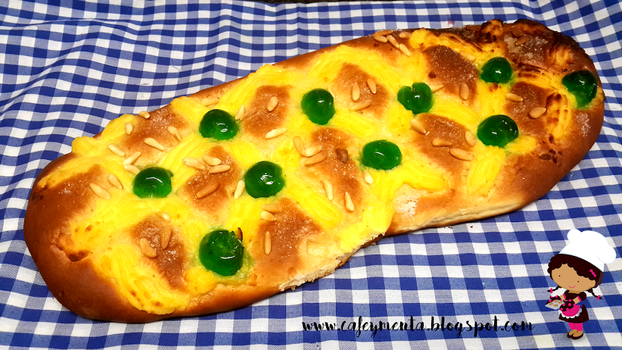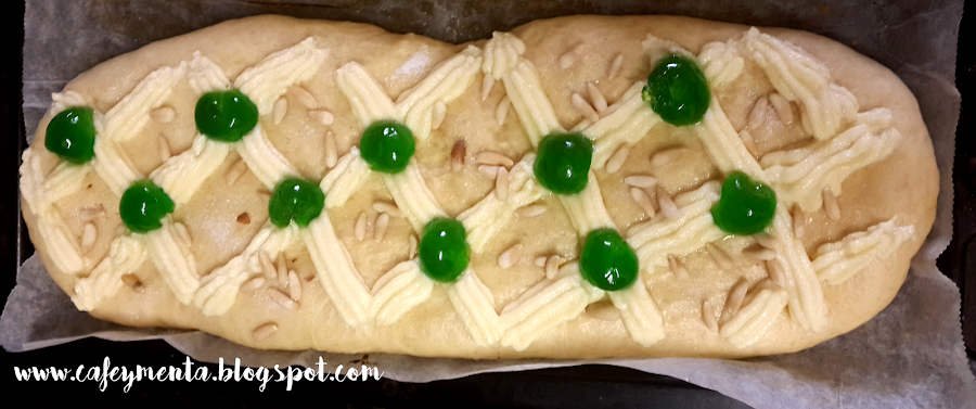 7. Cuando haya pasado la hora, veréis que la masa ha vuelto a augmentar su volumen. Es el momento de decorar la coca, poniendo la crema pastelera y las guindas a vuestro gusto, Yo seguí un patrón, haciendo pequeños rombos. La decoramos también con azúcar y piñones.