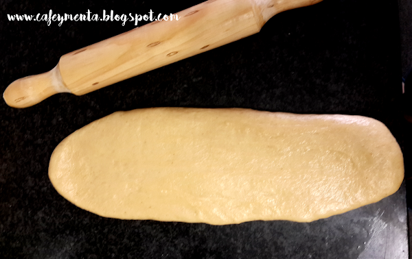 4. Una vez la masa ha levado, la sacamos del bol y le damos la forma deseada con la ayuda del rodillo. Las formas más comunes son o alargadas, como si fuera una barra de pan, o bien de forma rectangular. Yo elegí la forma alargada.