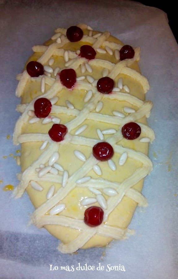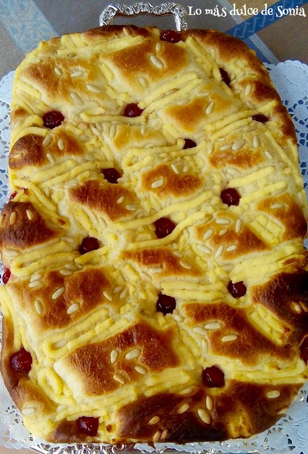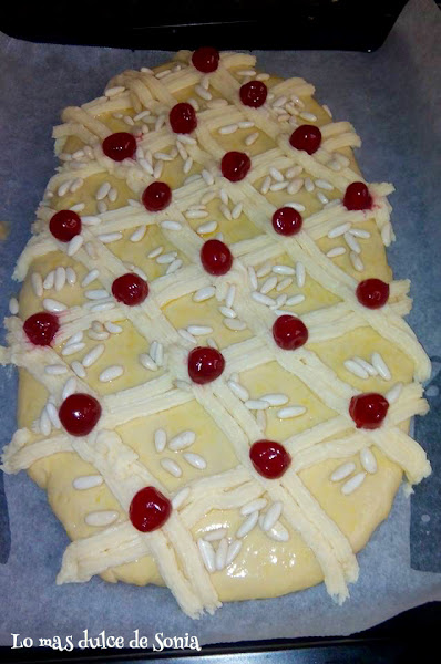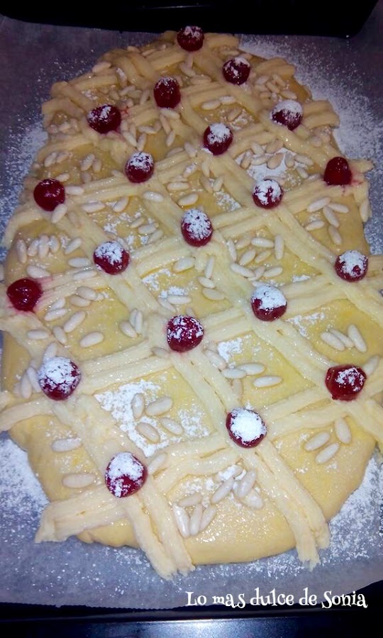 Adornamos con la crema pastelera, los piñones bien escurridos, las guindas o cerezas y espolvoreamos con abuntande azúcar glass.