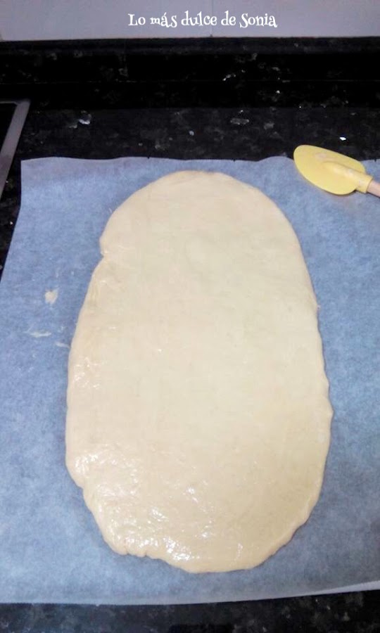 Transcurrido el tiempo, dividimos la masa en porciones. Estiramos dando forma ovalada con ayuda del rodillo. Hice una grande y otra pequeña.