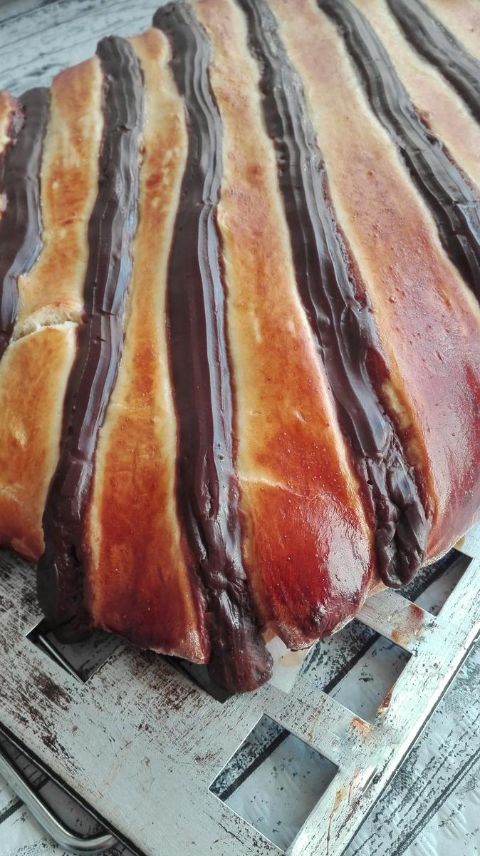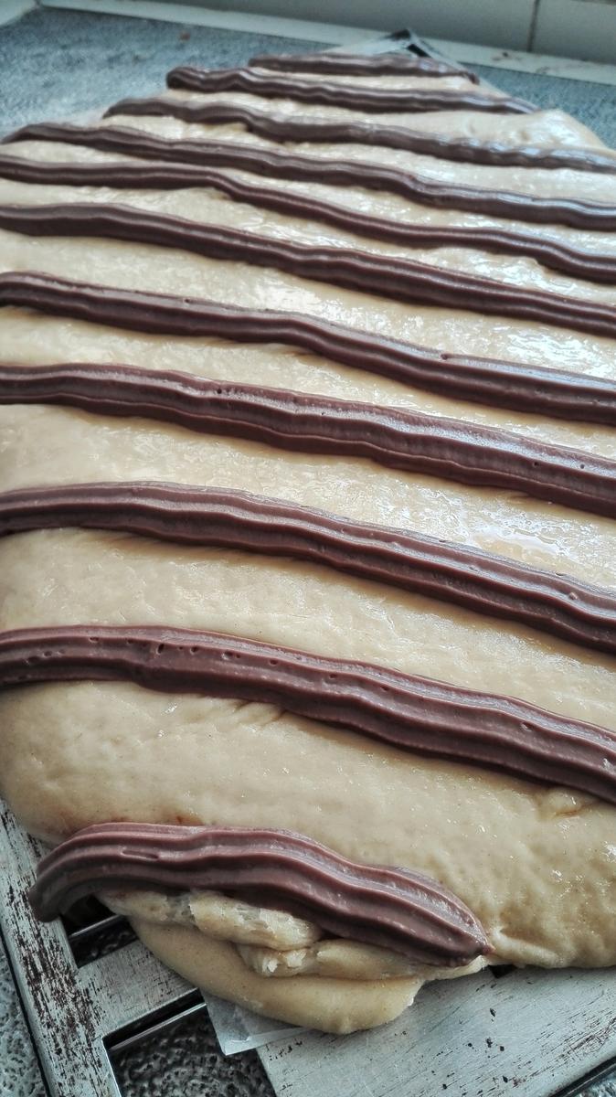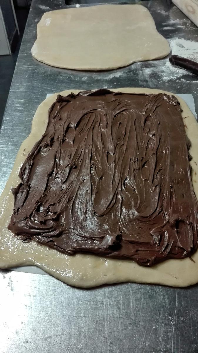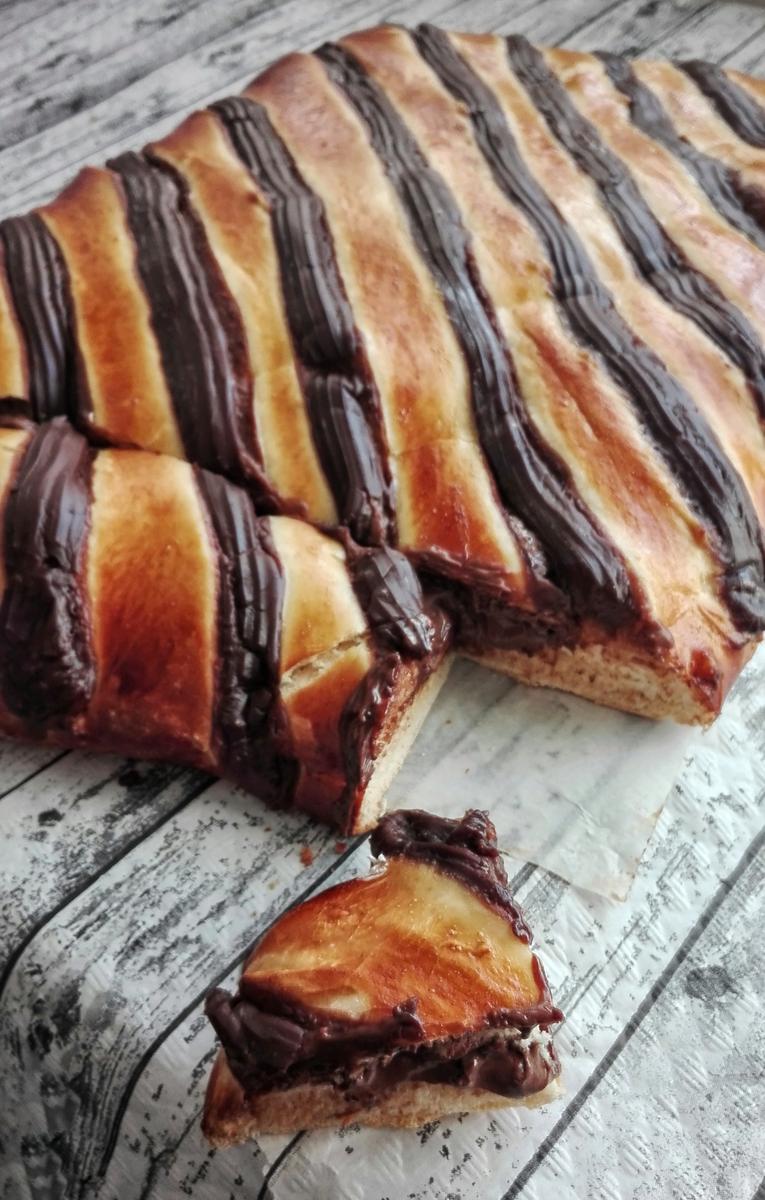Nosotros hoy la hemos hecho con crema pastelera de chocolate y muy muy rellena de Nocilla. Tanto, que ha sido bastante pringoso al cortarla, pero también te digo que mas de uno se ha chupado los dedos literalmente!