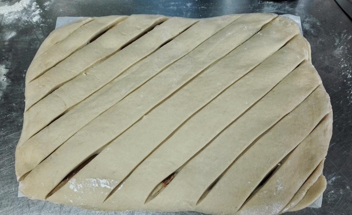 Pincelamos la coca con el resto de huevo batido, hacemos unos cortes por encima.