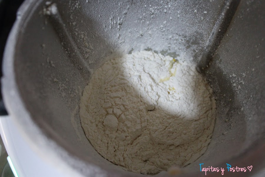 A continuación incorporamos la harina. Mezclamos primero 5 segundos a velocidad 4 y luego amasamos 2 minutos.