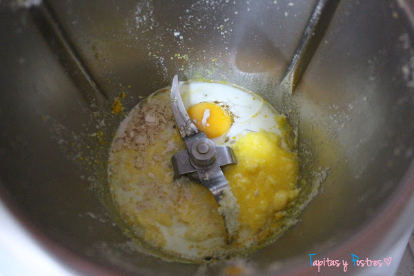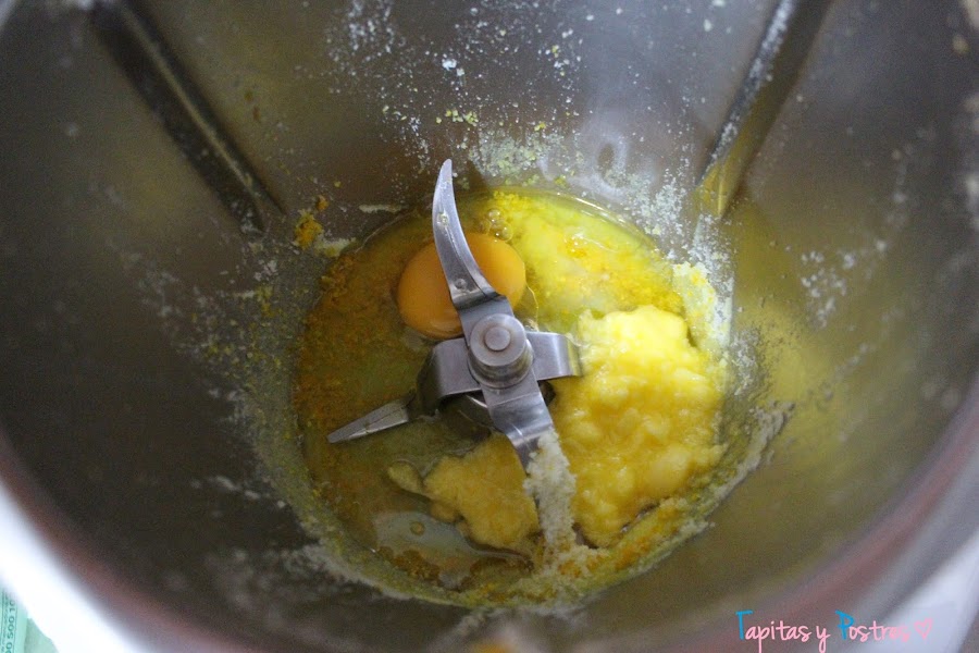 Mientras la crema pastelera se enfría, vamos preparando la masa. Ponemos las pieles de limón y naranja en el vaso de la thermomix y las trituramos 10 segundos a velocidad progresiva 7-10