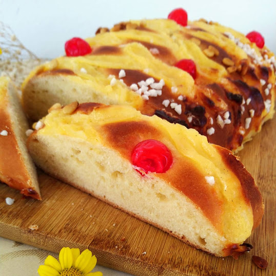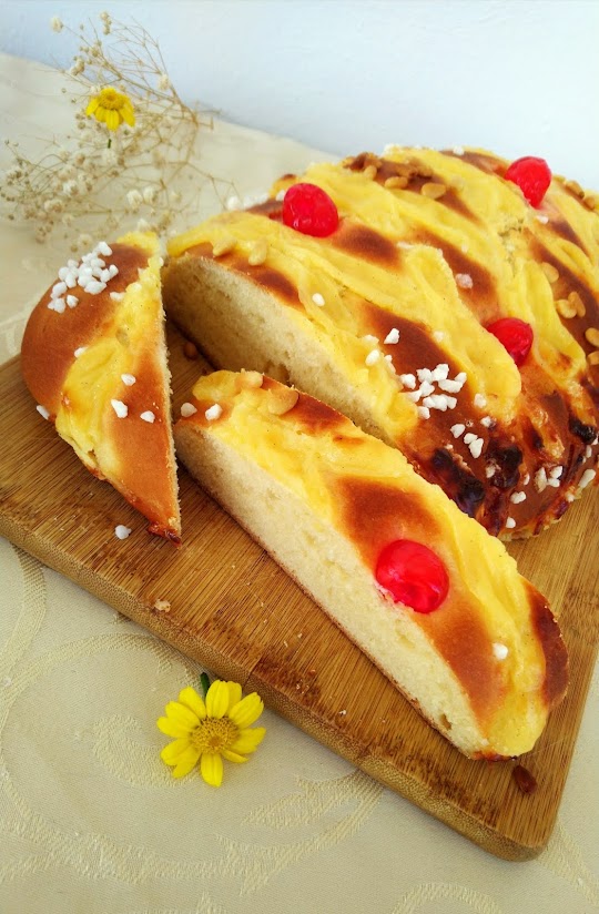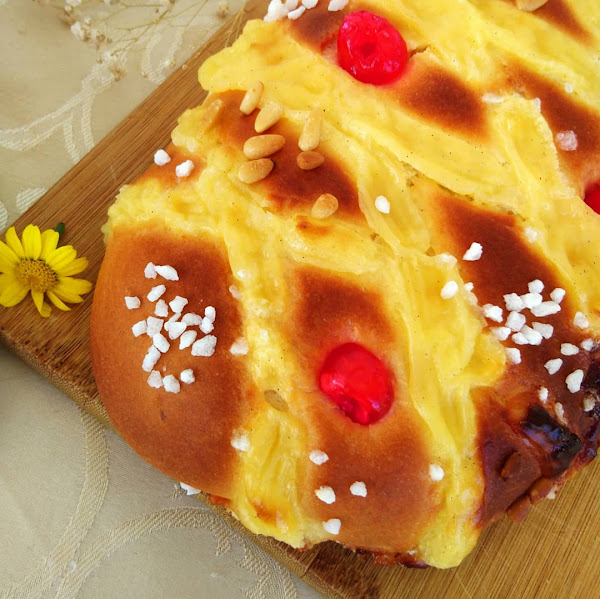 Me llamó la atención su aspecto e ingredientes y no hay masa dulce que se me resista. Ha sido un reto más y ya hace varios años que la elaboro. Las he hecho también en versión individual para regalar que viene ideal. Me encantan las guindas y los piñones...y adoro el decorado de crema pastelera. Es tipo brioche, hornada del día ideal para compartir con la familia. Os encantará el resultado. Queda una masa esponjosa y aireada gracias a la receta infalible de Xavier Barriga, maestro de obrador que recomiendo sigáis si aún no lo conocéis. No lo penséis más y animáos a hornear cosas nuevas, es más sencilla de lo que parece!