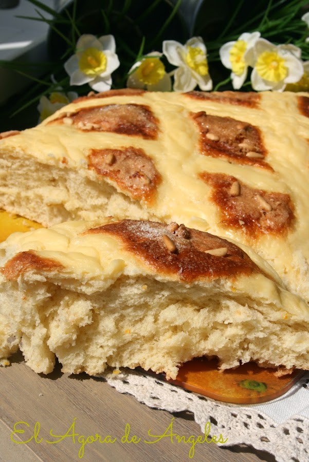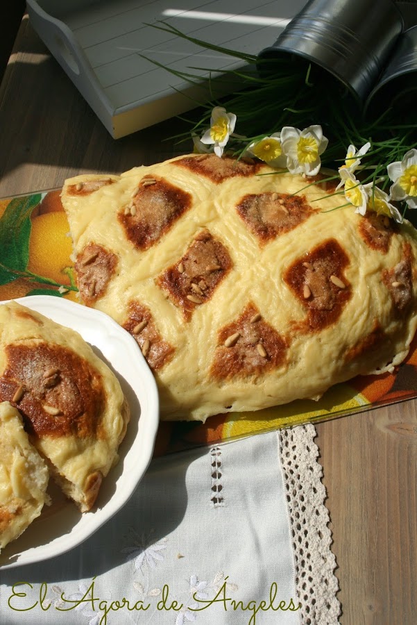 Pintamos con huevo batido, espolvoreamos azúcar, adornamos con la crema pastelera haciendo rombos, ponemos unos piñones y horneamos a 180º unos 25 minutos.