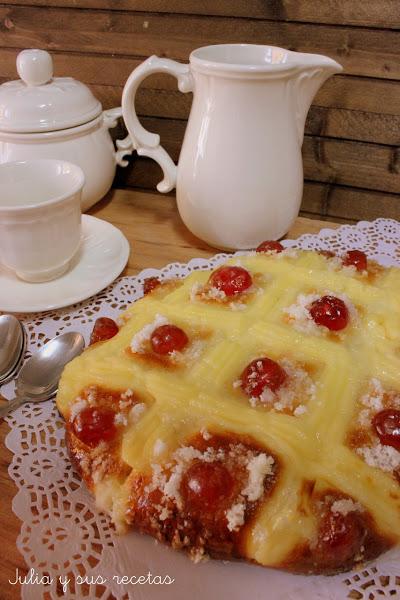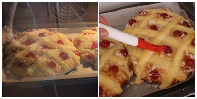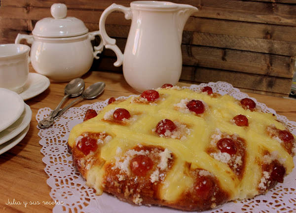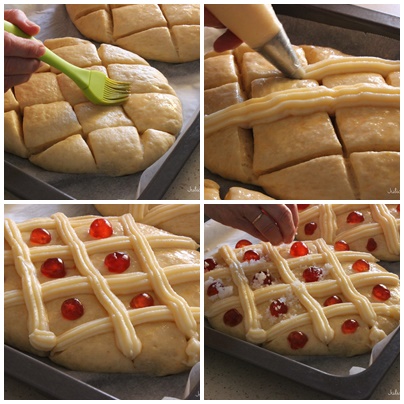Precalentamos el horno a 180º. Pintamos la coca con el huevo batido, rellenamos los cortes con la crema pastelera, ponemos las guindas en el centro de los rombos y alrededor ponemos azúcar humedecida en anís (licor).