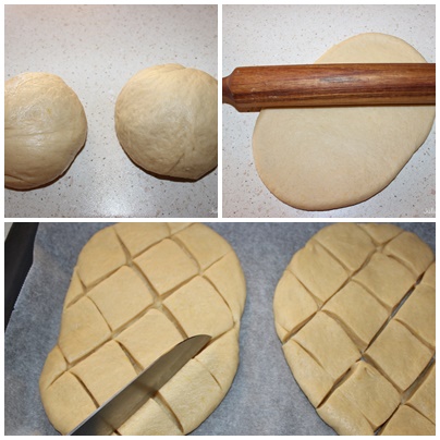 Le hacemos unos cortes profundos pero sin llegar a perforarla, en forma de rombos o cuadrados. Cubrimos las masa con un paño húmedo y dejamos que leve hasta doblar su volumen. Yo suelo poner cuatro vasos, uno en cada esquina de la bandeja y pongo el paño encima de los vasos para que no toque la masa.