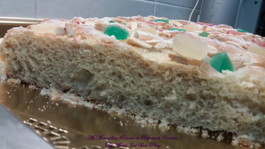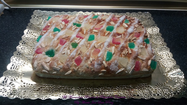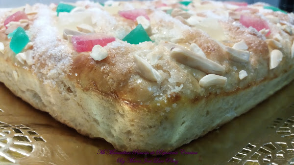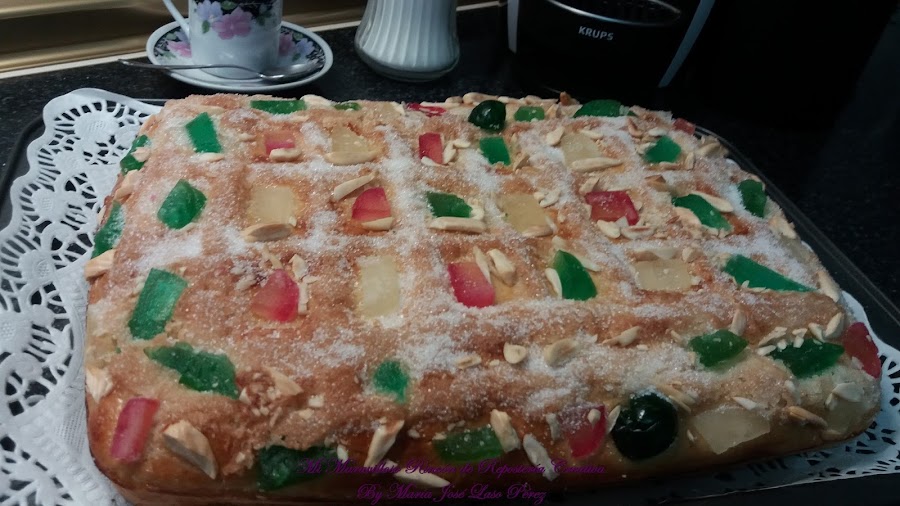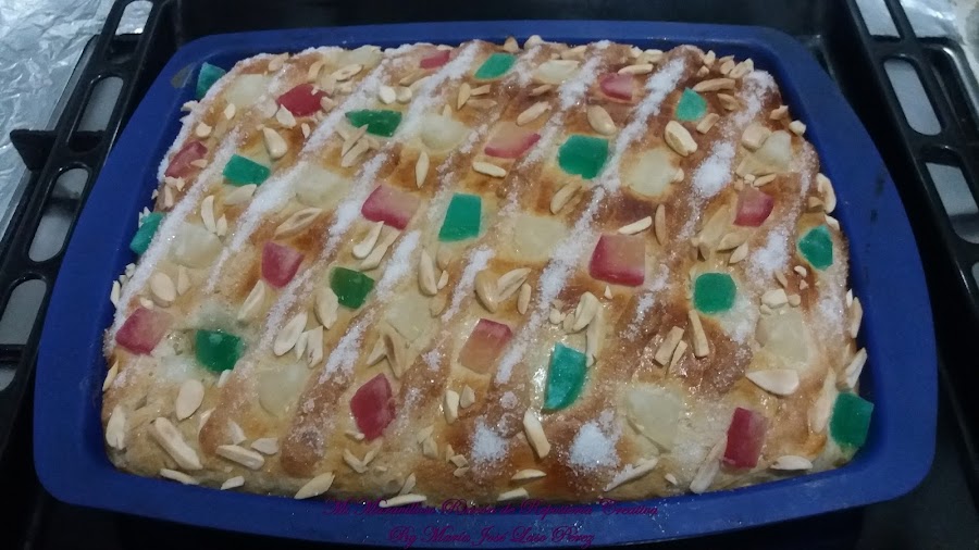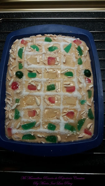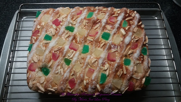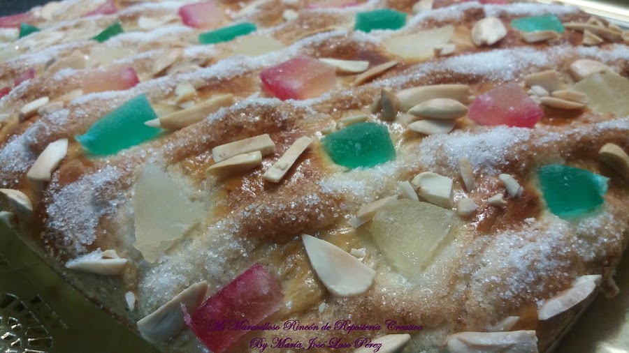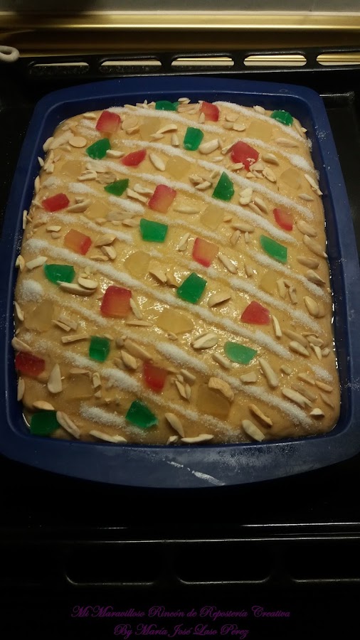 Y por último le añadimos la fruta escarchada y las almendras cortadas en trocitos. Si no os gustan las frutas escarchadas, podéis hacerla de crema pastelera, de cabello de ángel, con piñones, etc.., ¡hay versiones de la Coca de San Juan para todos los gustos!