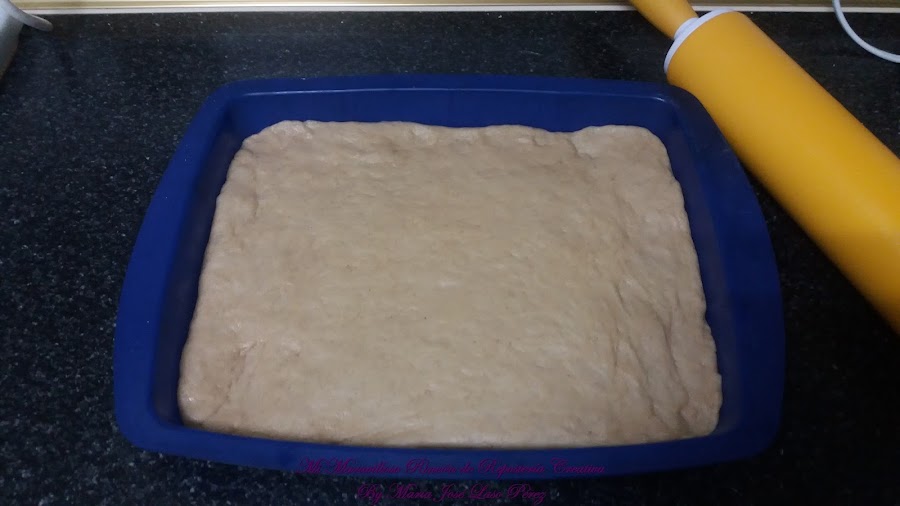 Engrasar el molde donde las vayáis a hornear (yo las horneé en éstos de silicona,que no necesitan ser engrasados). Las formas de las cocas suelen ser ovaladas o rectangulares. Extender con el rodillo la masa dejándola de 1,5 cm de espesor.