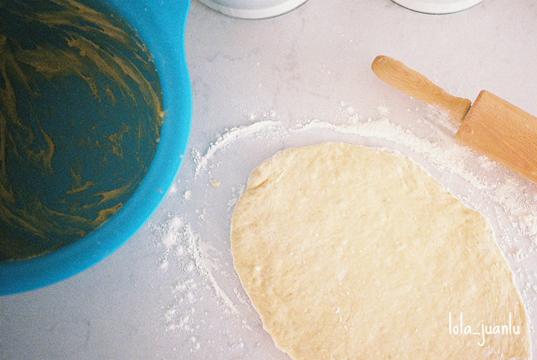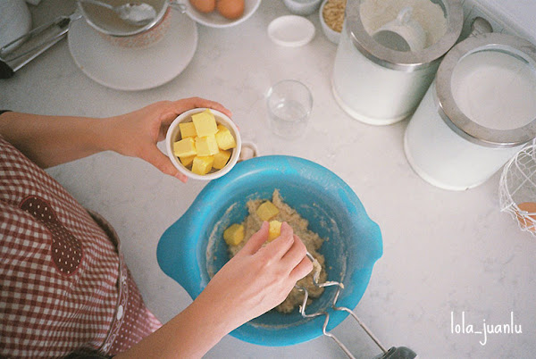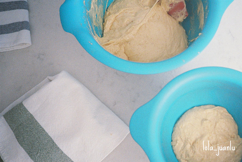 Agregamos la mantequilla y seguimos amasando hasta que la masa la haya absorbido.
