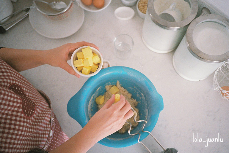 La mantequilla debe de estar fresca pero no demasiado dura, de manera que, una vez que la hemos cortado en dados pequeños, la reservamos en la nevera si hace mucho calor.