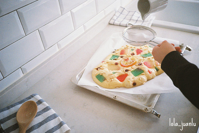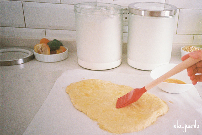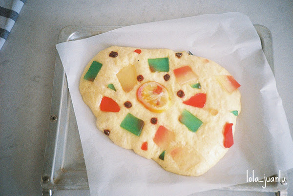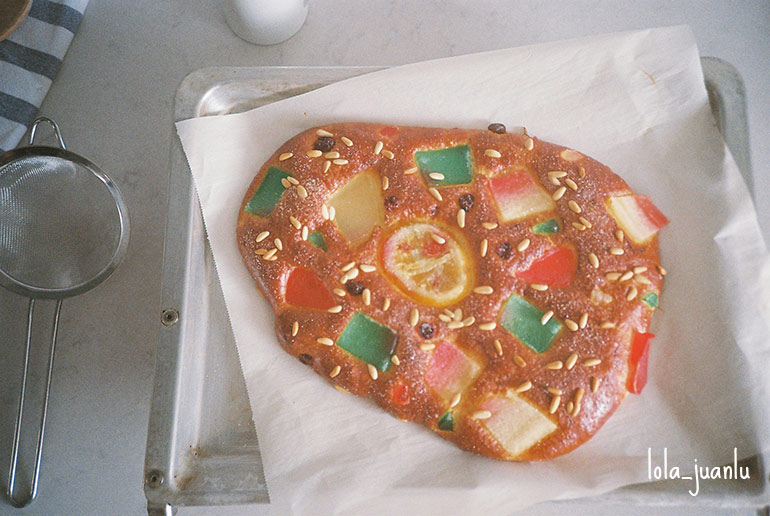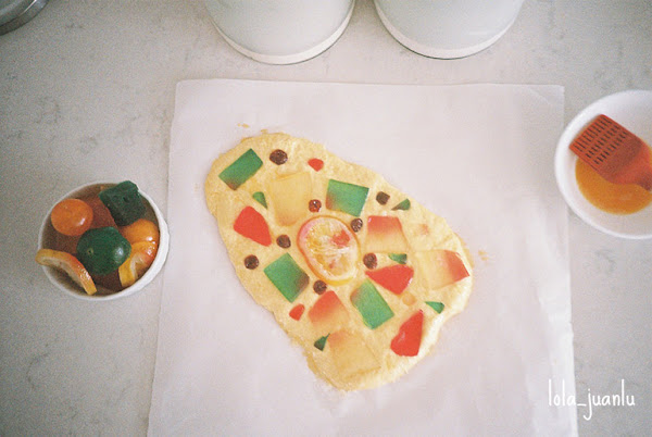 Decoramos con la fruta confitada. Es importante que presionemos las piezas de fruta para que a la hora de la fermentación y el horneado no se despeguen de la masa.