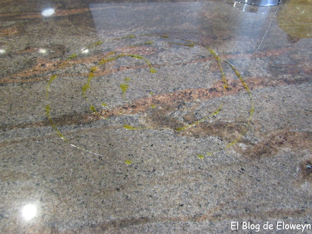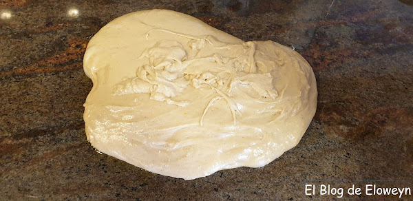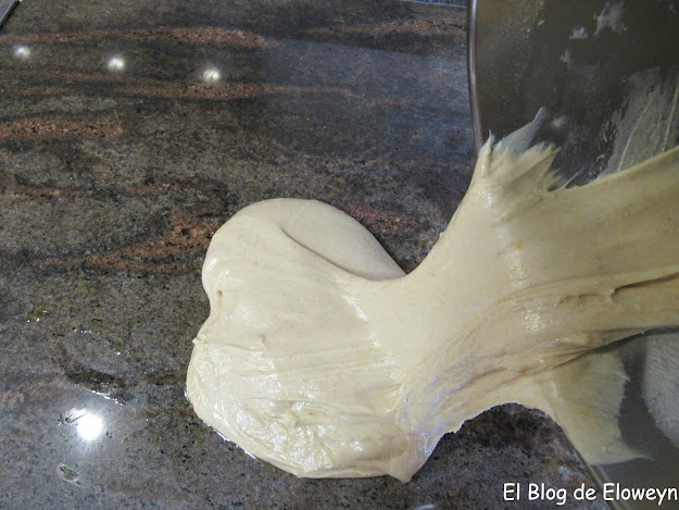 Es una masa bastante pringosa y muy elástica. Limpiamos bien el mármol de la cocina ponemos aceite.