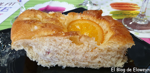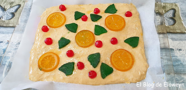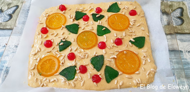 Adornamos con la fruta confitada. Un consejo: No hagáis lo mismo que yo, que puse las rodajas de naranja y las cerezas enteras. Partidlas por la mitad. (En el caso de la naranja, también podéis partirlas a cuartos) ¿Y por qué? Pues porque enteras pesan mucho, y cuando la masa leve, al pesar mucho, os pasará como a mi, que se acabaron hundiendo. Si las partís por la mitad pesarán menos y no se hundirán (o al menos, no se hundirán tanto como se hundieron las mías)