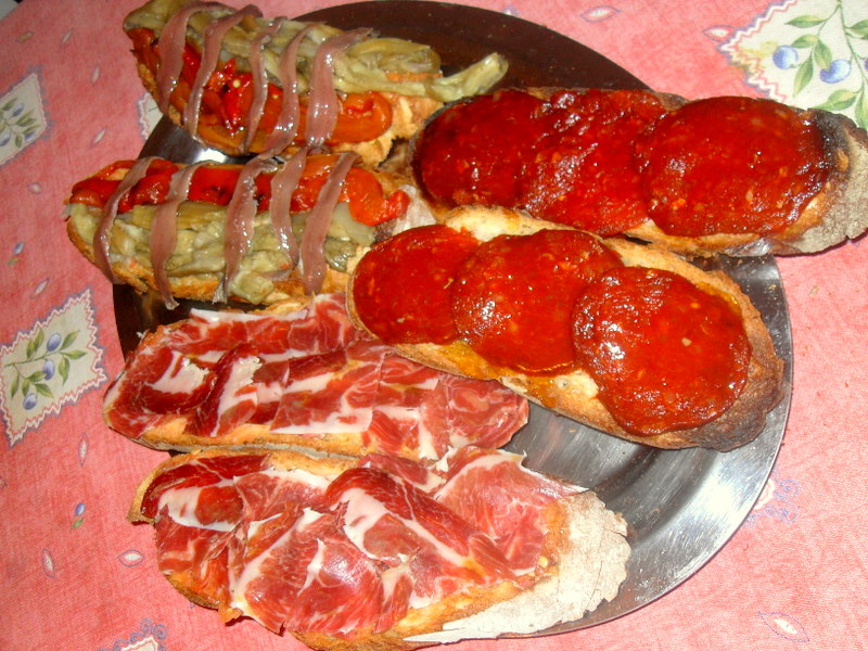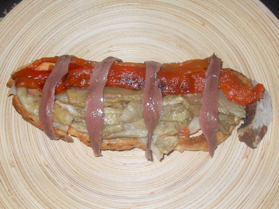 Tosta de pan con tomate y jamón serrano, tosta de escalibada y anchoas de La Escala y por último, tosta de queso rulo de cabra con sobrasada y miel por encima.