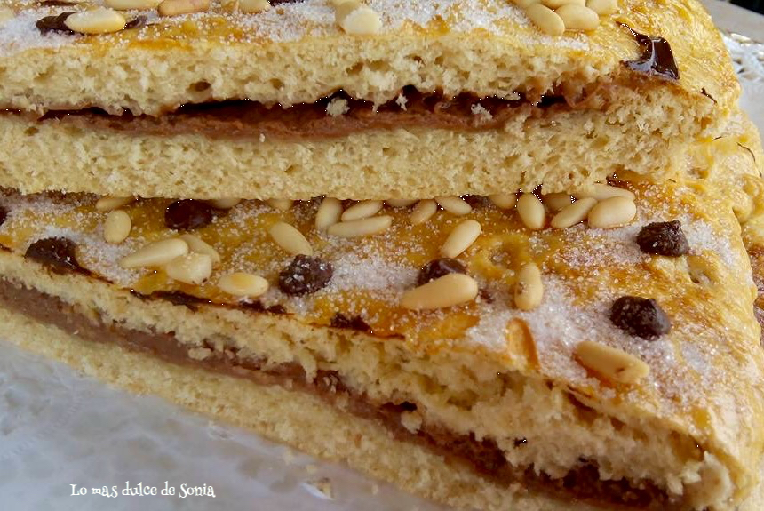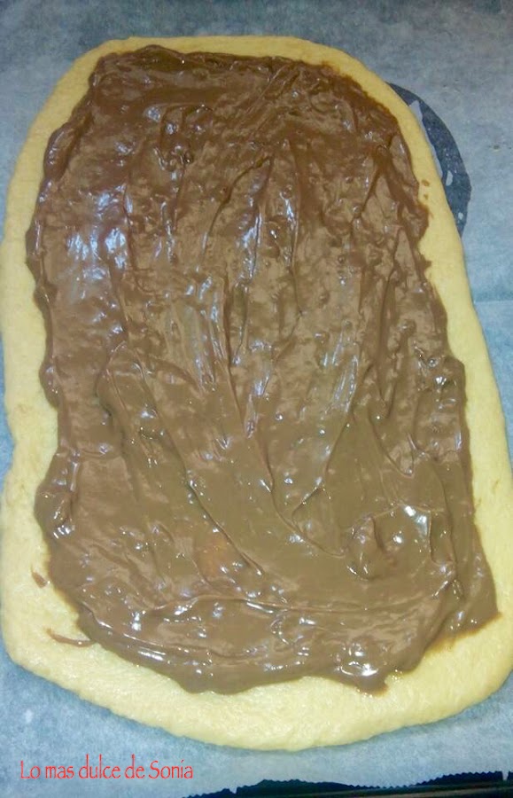 Estiramos una parte de la masa, la colocamos sobre la bandeja de horno forrada con papel de hornear, rellenamos con la crema de chocolate y tapamos con la otra parte de masa estirada. Sellamos los bordes, pintamos con huevo y adornamos. La gotitas de chocolate las pondremos cuando tengamos nuestra coca horneada.
