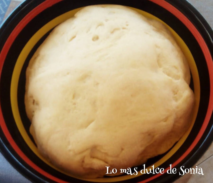Incorporamos la harina, la mantequilla, los huevos, la vainilla, el azúcar y la sal. Amasamos hasta obtener una masa elástica. La ponemos en un bol, tapado con un paño limpio durante una hora y media, tiene que doblar el volumen. Ahora con la calor que hace en apenas media hora es suficiente, así da gusto.