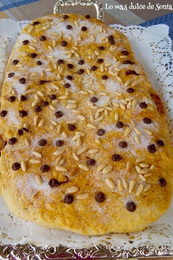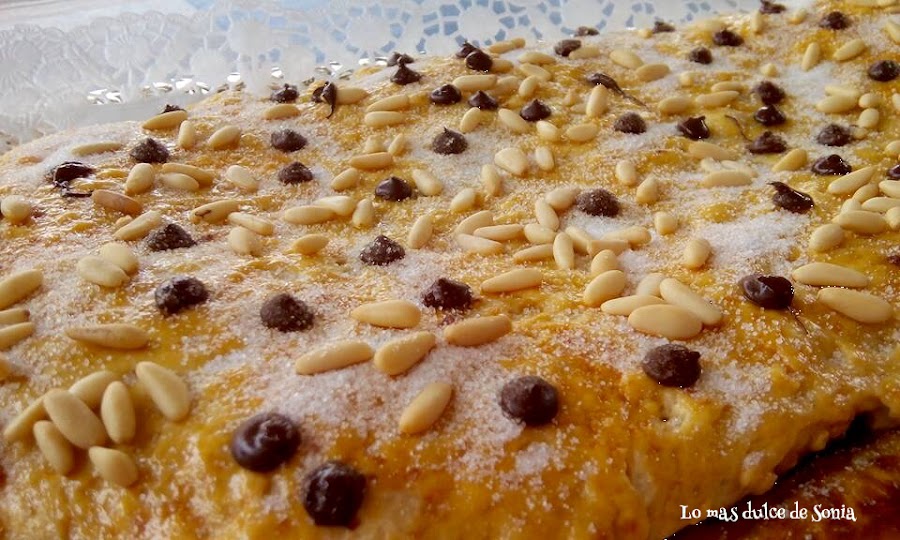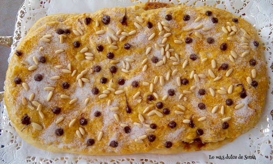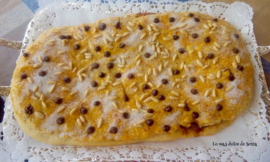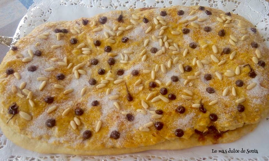 Cuando la masa haya levado, desgasificamos (amasamos ligeramente la masa para quitarle el aire), dividimos en dos trozos. Estiramos una parte, cubrimos de crema de chocolate y cubrimos con la otra parte de masa estirada. Sellamos los bordes, pintamos con huevo batido y adornamos. Las gotitas de chocolate las pondremos después de que hayamos horneado la coca.