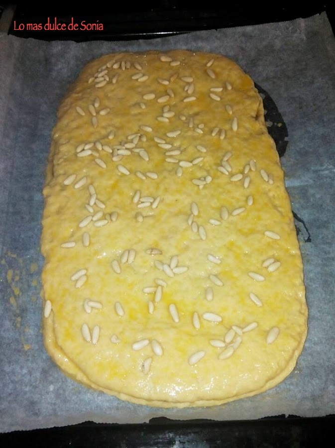 Dejamos reposar la coca mientras precalentamos el horno a 180º.