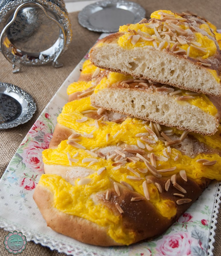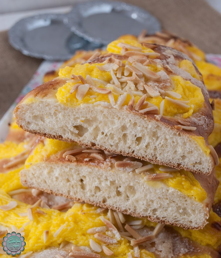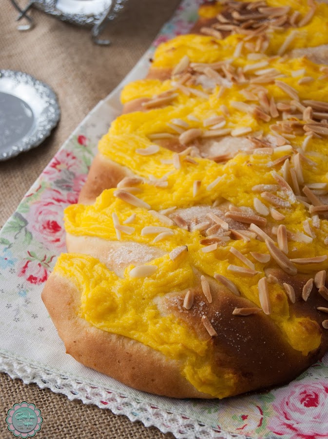 5) Tapamos y dejamos reposar 1 hora más. Precalentamos el horno a 180º, decoramos al gusto con la crema y las almendras, piñones, guindas, etc. y espolvoreamos con azúcar humedecido en agua de azahar. Horneamos hasta que estén doradas.