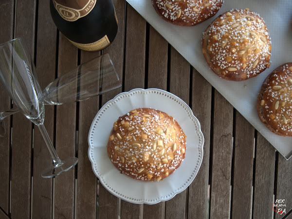 Preparar los ingredientes que utilizaremos para la cobertura. Batir el huevo y pintar los discos con ayuda de un pincel. Colocar por la superficie los piñones, los confitados (naranja y jengibre) y el azúcar granillo.