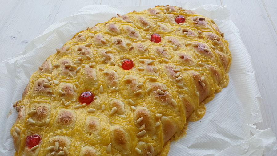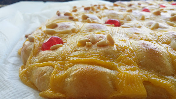 Alrededor de esta fiesta mágica han surgido también multitud de tradiciones gastronómicas, y entre ellas se encuentra esta coca dulce tan típica. Por encima puede llevar azúcar y frutas confitadas de diversos tipos o, como en este caso, crema pastelera que, en casa, nos encanta.