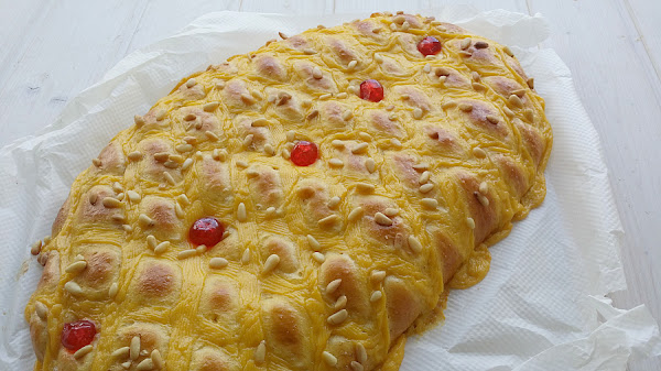 6. Pintamos la masa con un huevo batido. Disponemos la crema por encima, con ayuda de una manga pastelera, a nuestro gusto; yo he formado un enrejado. Decoramos con piñones y cerezas confitadas, u otras frutas confitadas que nos gusten.