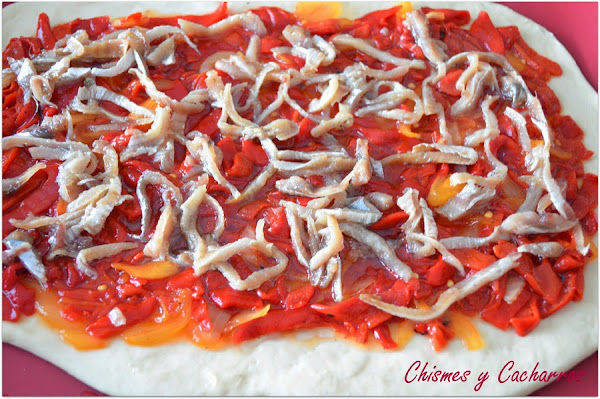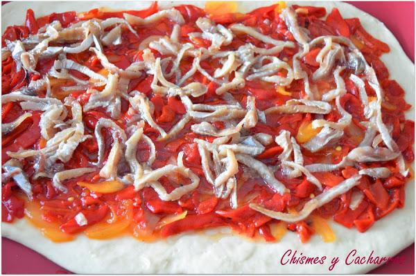 Extirar la masa y colocarla en un papel de horno ya sobre la bandeja de hornear. Abrir la lata de ensalada, son pimientos de piquillo asados cortados en tirar y cebolla en aceite. Verter sobre la masa y repartir por toda ella. Cortar los filetes de sardinas en tiras y colocar sobre los pimientos. Calentar el horno a 200º y hornear hasta que la masa esté dorada, unos 30 minutos.
