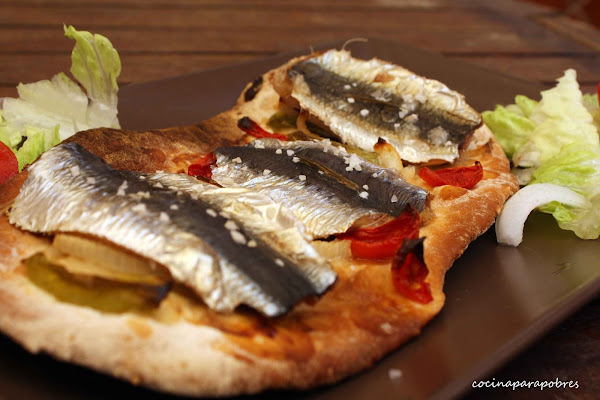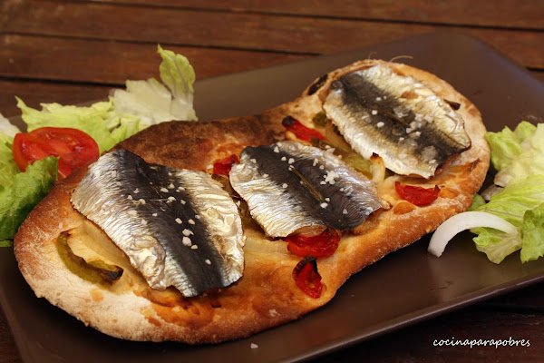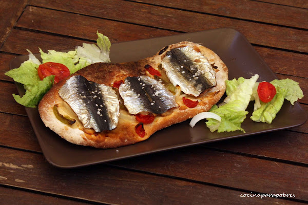 Cortamos el pimiento y la cebolla en tiras, colocamos sobre la masa y horneamos con el horno precalentado a 200 º C con calor arriba y abajo, aproximadamente 15 minutos, pasado este tiempo sacamos y colocamos las sardinas limpias, volvemos a hornear 5 minutos más y a comer.