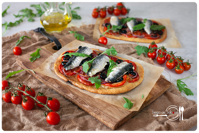 Esta coca de sardinas se inspira en la anterior aunque es mucho más sencilla. Sobre una masa delgada se colocan rodajas finas de tomate, de cebolla y de aceitunas negras; finalmente se ponen los lomos limpios de las sardinas al hornoy a !comer!. Una delicia que aúna lo mejor del campo con lo más sabroso de la mar.