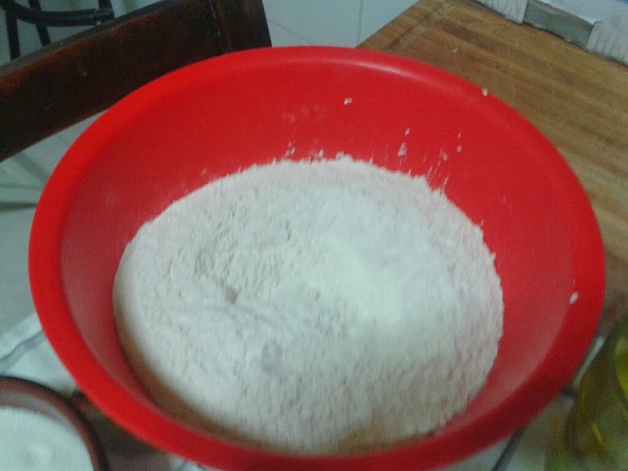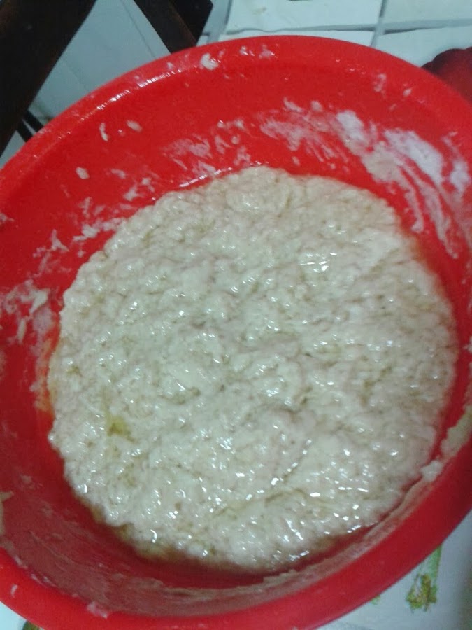 lo mezclamos con la harina y empezamos a mezclar con las manos, echamos ahora el vaso de agua caliente, azucar y aceite oliva y amasamos hasta que se despegue..... dejamos fermentar un rato, hasta que suba de volumen.