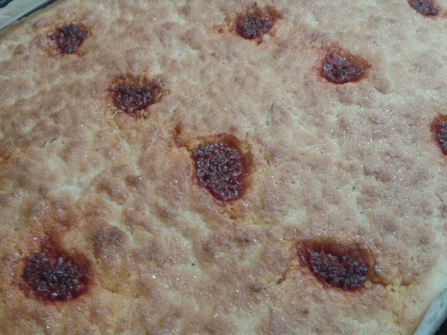 A continuación estiraremos la masa encima de la placa del horno, vamos haciendo bolitas de sobrasada y las colocamos encima de la masa, despues espolvoreamos las cuatro cucharadas de azucar por encima.