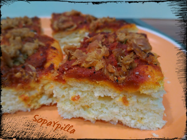 Sofrito: 250g. tomate triturado, 2 cebollas, 1 zanahoria, 2 ajos, 2 latas de atún, 1 cta. bicarbonato, sal, aceite y orégano.