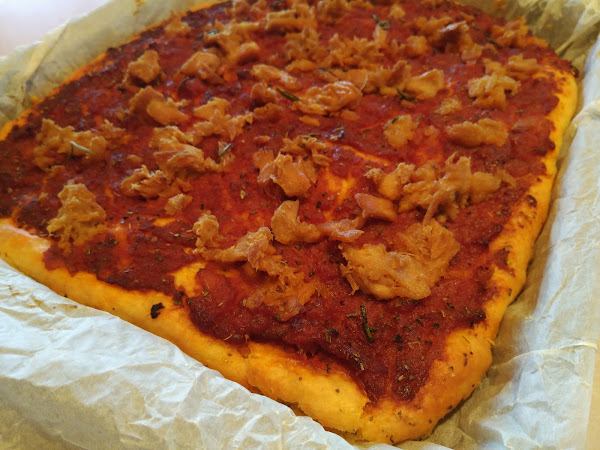 - Extendemos el sofrito con cuidado sobre la masa, espolvoreamos el orégano y el atún, desmenuzando con las manos.