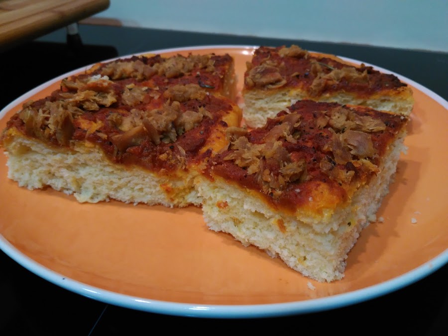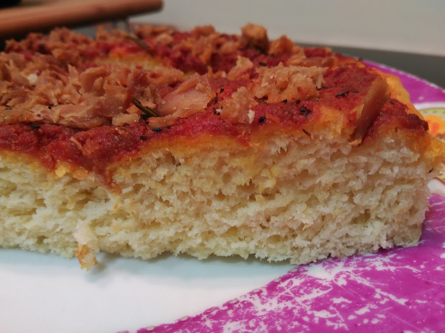 La verdad que, acostumbrada a hacer siempre las masas con la Thermomix, nunca imaginé hacer del modo tradicional una masa que quedara tan superesponjosa. Queda de fábula, buenísima para una cena de esas de pim-pam que no te quieres liar mucho, y para tener invitados, porqué sale una señora coca. La de la foto era con la mitad de ingredientes y mirad que altura!!
