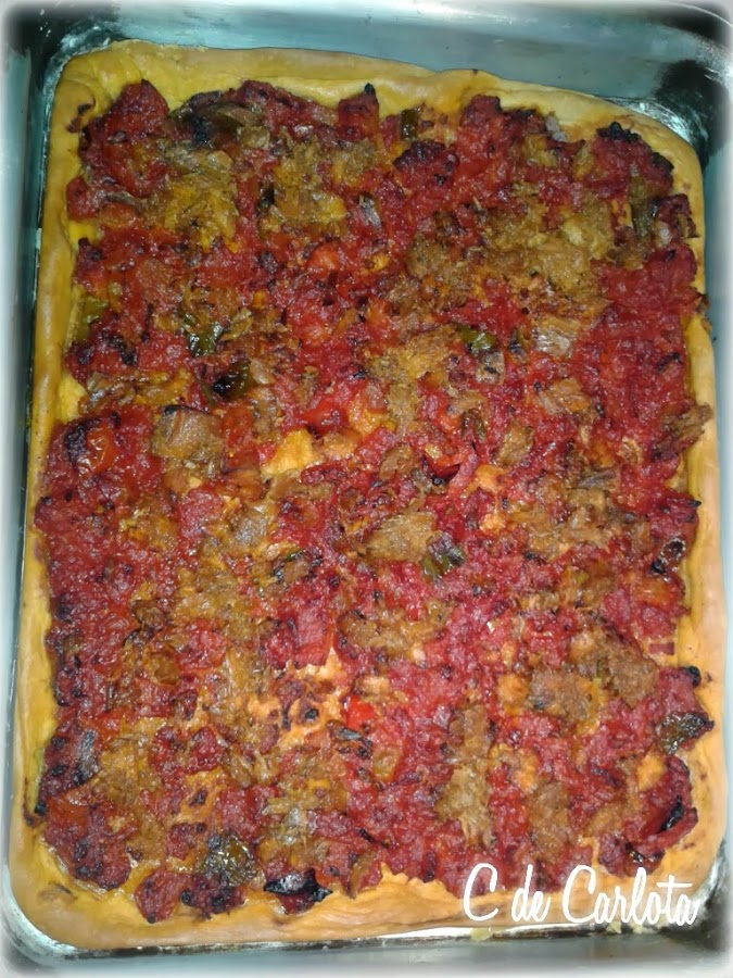 Esta coca es muy fácil y muy simple, ya que no es la típica con atún, piñones y huevo, esa la haremos otro día, sino que con tres ingredientes básicos la tenemos hecha.