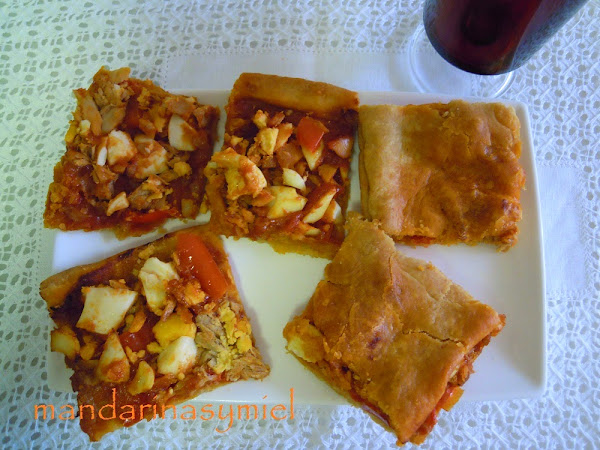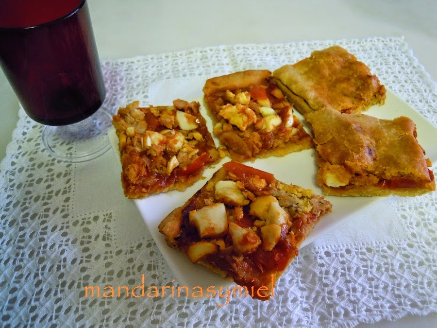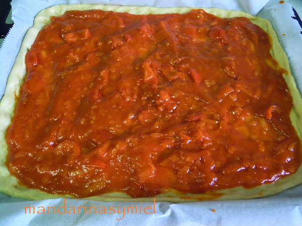 Las cocas de tomate se pueden elaborar tapadas o destapadas, es lo mismo, solo que las tapadas llevan otra capa de masa encima. Yo la he preparado hoy destapada, en las fotos veréis algún trocito tapada, me sobraron de la que hice ayer, pero no pensé en hacer las fotos, así que hoy he puesto unos trocitos.