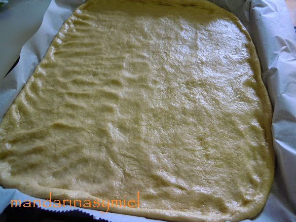 Estira la masa de forma rectangular y ponla en la bandeja del horno encima de papel de horno, pínchala con un tenedor.