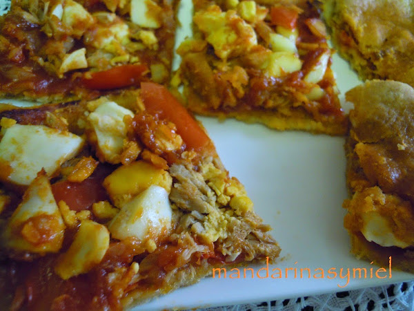 Extiende el relleno sobre la masa, añade el atún, los huevos en trocitos no muy pequeños y los piñones (no los ves en la foto porque se me olvidó ponerlos)...