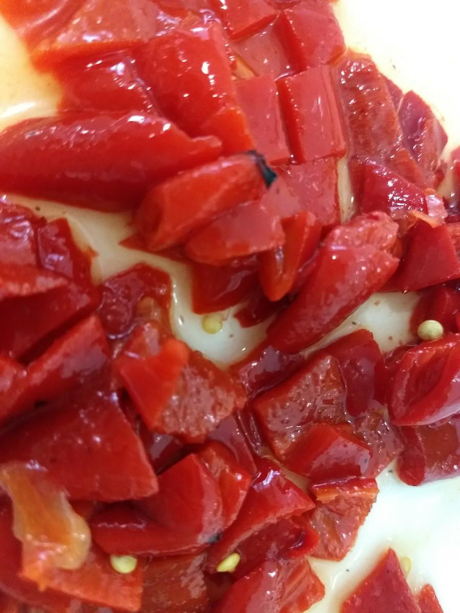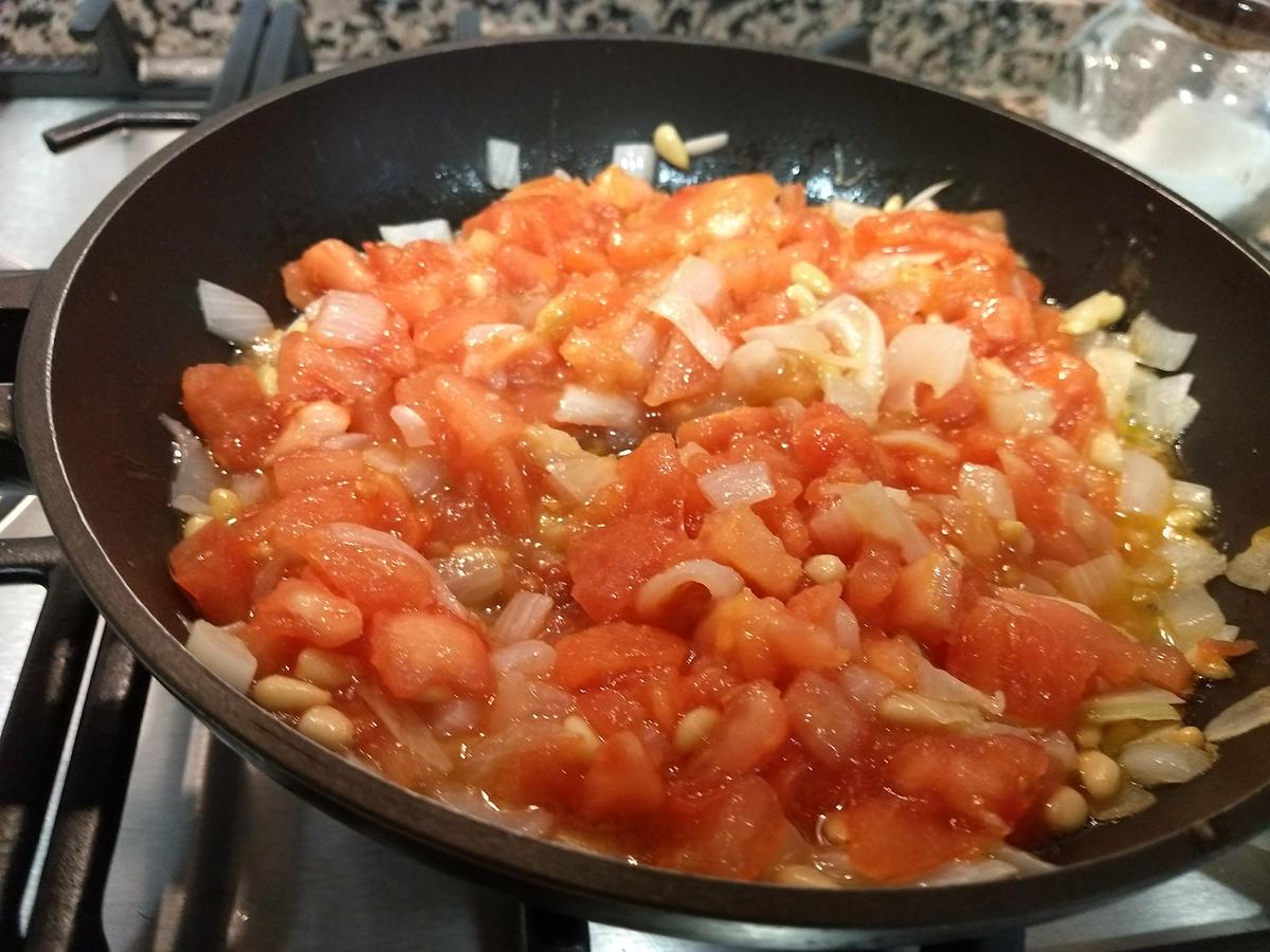 Cortar los pimientos a tiras y añadir a la cebolla, dejar cocer 5 minutos y añadir el tomate troceado.