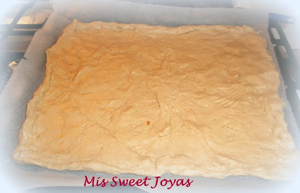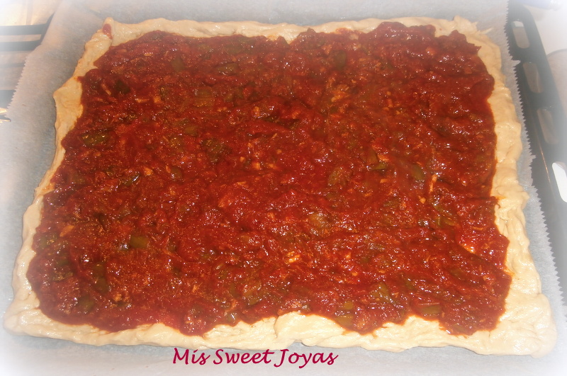 Pasada la hora, extendemos con el rodillo la masa en una bandeja (bien con aceite para que no se pegue o con papel de hornear), haremos como una especie de barandilla para que no se salga la mezcla y al horno precalentado a 200ºC durante unos 30 minutos. Sabremos que está hecha cuando los bordes estén tostados.