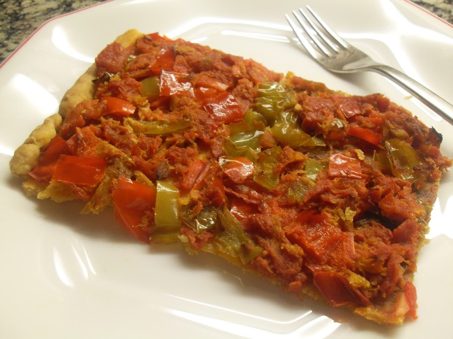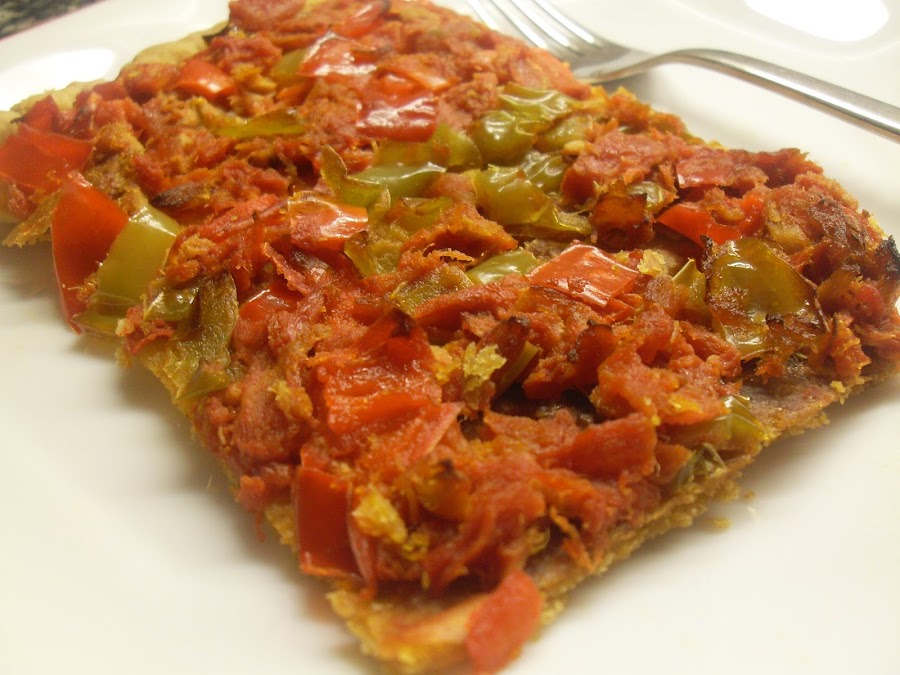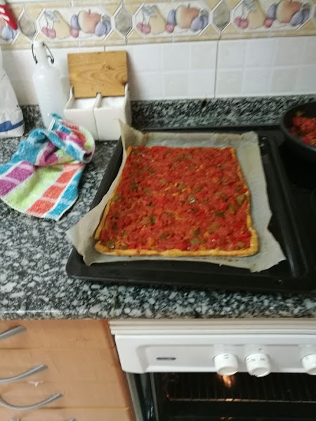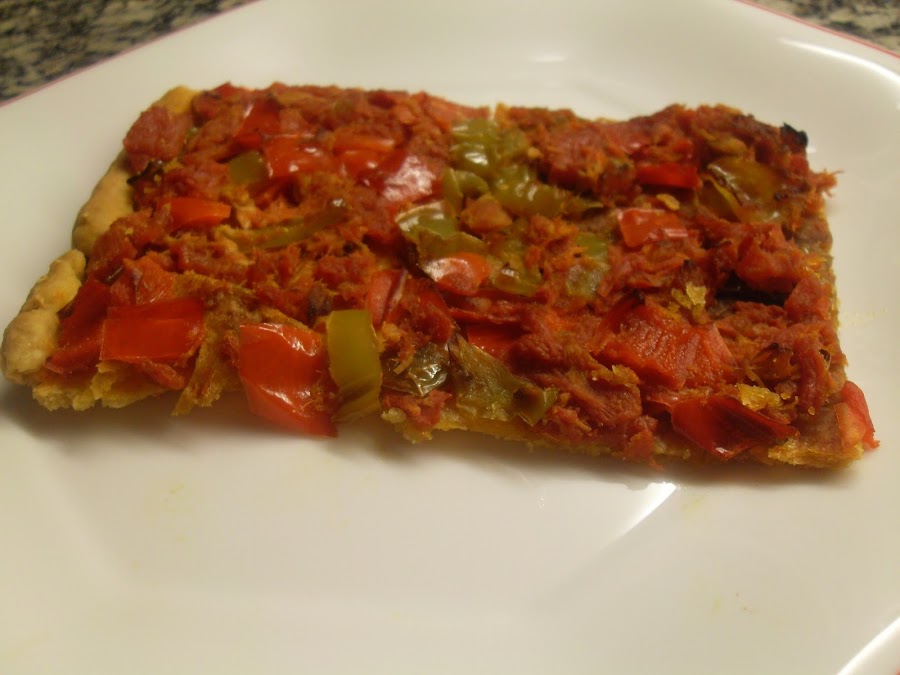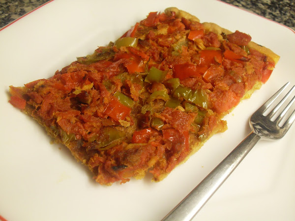 Poner encima de la masa el atún escurrido y desmigajado, cubrir con el sofrito de tomate y encima el pimiento frito, por último espolvorear lo piñones tostados.