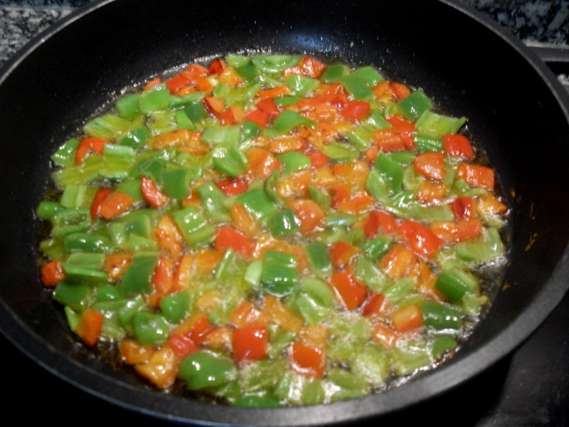 Lavar, secar y cortar los pimientos en trozos, y freír en otra sartén con un poco de aceite ligeramente.