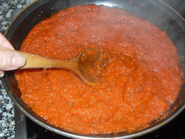 En una sartén con un poco de aceite añadir el tomate triturado (que puede ser de bote), agregar una pizca de azúcar para quitar la acidez y otra igual de sal, remover y tapar para que se cocine.