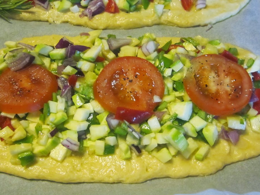 Pinchamos con un tenedor y añadimos las verduras, ponemos el tomate en rodajas,