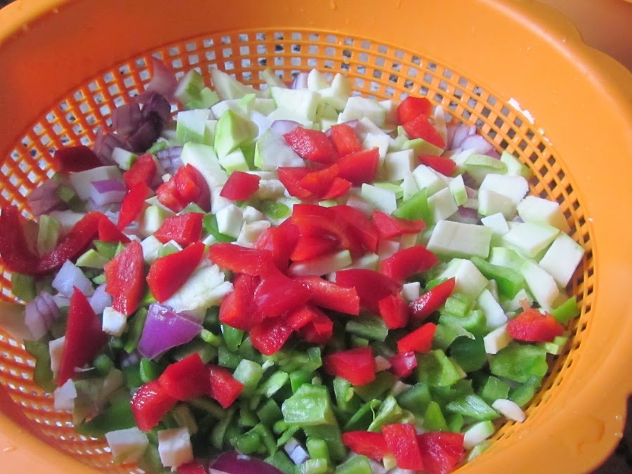 Troceamos las verduras y las dejamos en un bol, donde aliñamos con sal,pimienta y aceite, picamos unas hojas de albahaca fresca.