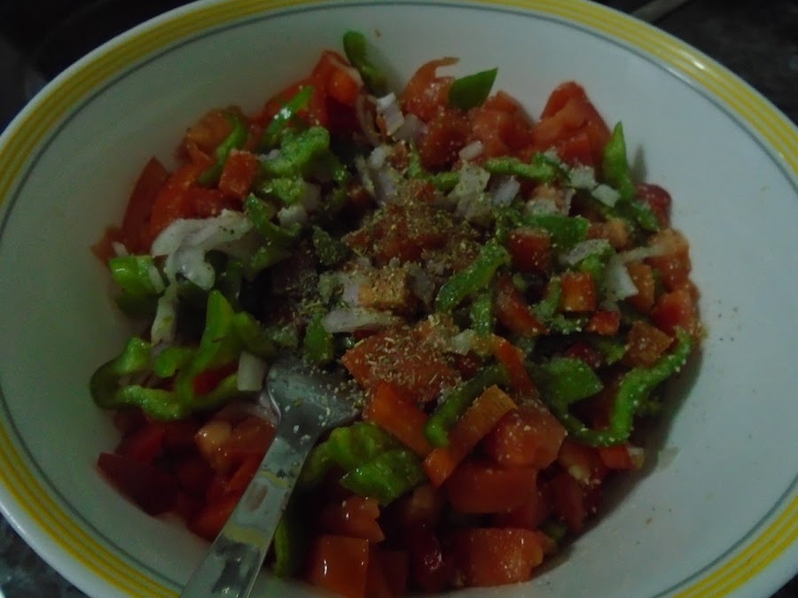 Cortamos las verduras en trozos pequeñitos para hacer el trampó , las introducimos en un bol y aliñar con aceite de oliva, sal, pimentón dulce, remover para que se maceren todos los ingredientes.