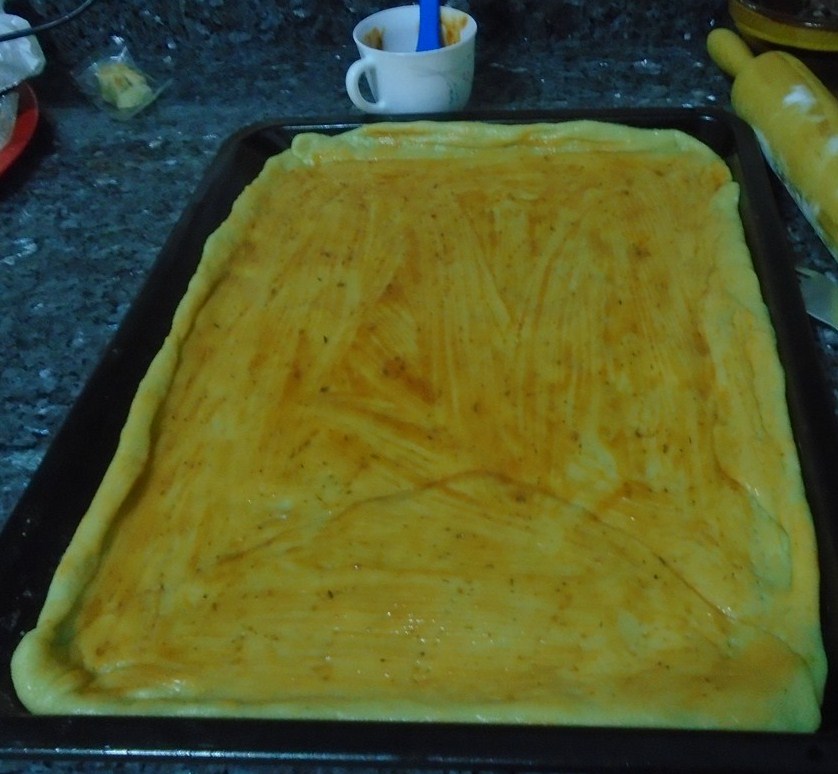 Estiramos la masa y la extendemos sobre la bandeja del horno que previamente estará untada de aceite, estiramos bien la masa por toda la superficie y le haremos unos bordes por cada lado pinchándola con un tenedor.